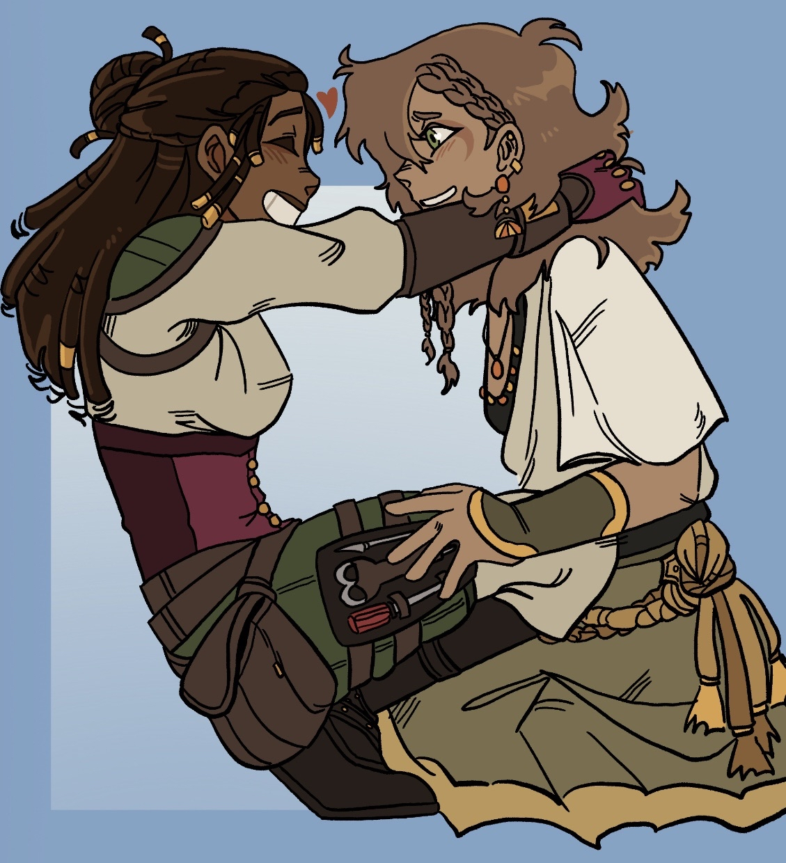 The inventor/artificer, Calliope can build and fix any machine. She is 2 years younger than you, petite, with gold eyes, rich brown skin and black hair in multiple braids. Her hair and clothes are adorned in rings, belts, and pins which double as tools. She carries a man’s cane sword with her everywhere, which she wields in a fight along with a hand crossbow. She’s curious, optimistic, excitable, and easily distracted by her many projects, but much of that is to keep her mind occupied. In quiet moments when she thinks no one is looking, you glimpse a profound sadness on her features.